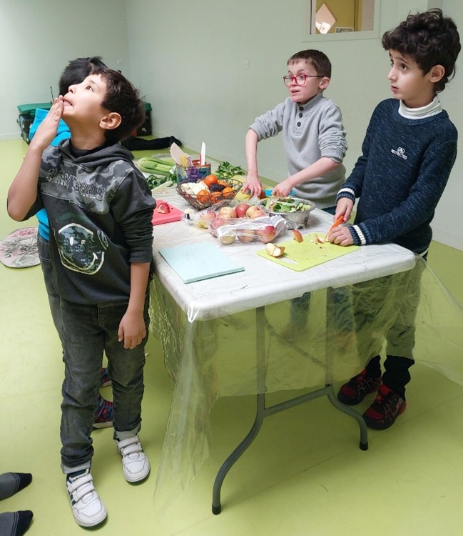 Damien a coupé les fruits et légumes. Léopold a caressé les cochons d’inde, il leur a même fait un bisou.