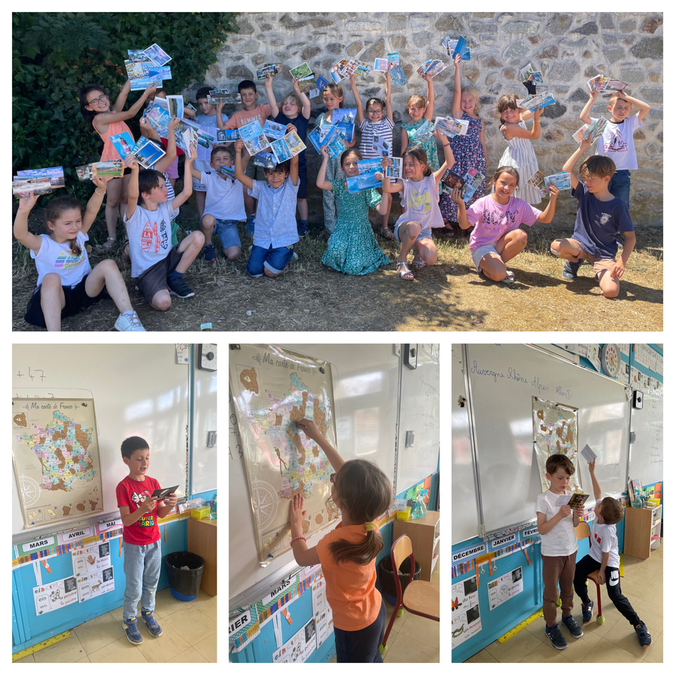 Cette année, la classe de CP/CE1 s’est lancée dans un projet passionnant autour des cartes postales ! Chaque semaine, nos élèves ont reçu des cartes postales envoyées depuis des villes et départements variés de toute la France. Sur l’ensemble de l’année nous avons collecté plus de 120 cartes provenant de différentes régions françaises. À travers les cartes reçues, les élèves ont découvert les richesses de notre patrimoine : architecture, traditions, spécialités culinaires, et bien plus encore.