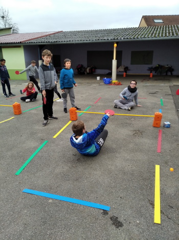 En Cm1-Cm2, nous ne nous laissons pas aller. Après le rugby en première période, nous avons vécu une séquence de tennis de table. Nous avons réinventé cette pratique lors d’une séance menée en extérieur. Sans table à notre disposition, des terrains de jeux furent délimités et une barre nous servit alors de filet. Une adaptation supplémentaire fût nécessaire : jouer assis et sur les tables fictives ! Nous avons beaucoup ri et avons poursuivi le travail de notre ceinture abdominale en nous étirant, nous redressant, nous allongeant afin de renvoyer les balles.