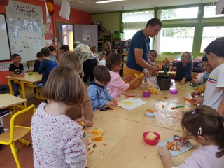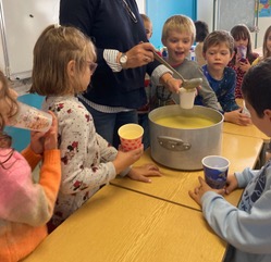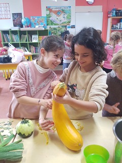 Les classes de CP/CE2 et CP se sont rassemblées pour préparer une soupe avec les légumes de saison. Avec la participation des parents qui ont bien voulu partager potimarrons, courgettes, carottes…ramassés dans leur potager, cette préparation a été l’occasion de découvrir les légumes de saison, d’apprendre à les peler, les couper et les cuisiner !