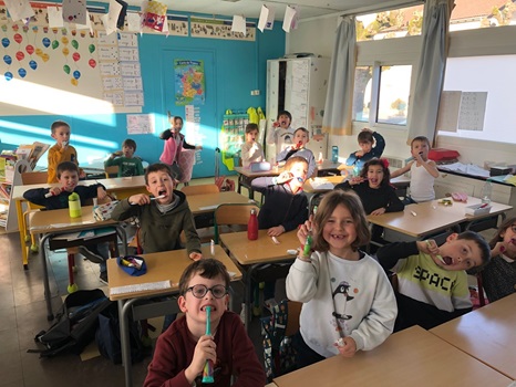 Nous avons apporté nos brosses à dents à l’école : nous avions hâte de les utiliser mais il a fallu patienter ! Maîtresse nous a même donné un dentifrice à chacun que nous avons pu garder chez nous.