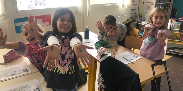 Dans la classe de CP/CE1, nous travaillons sur l’hygiène. Nous avons d’abord expliqué de quoi il s’agissait sous la forme d’une grande carte mentale (sommeil, alimentation, santé, dents, lavage, écrans, hydratation,…). Nous avons ensuite découvert ce qu’était un microbe, avec quoi on pouvait l’observer et comment s’en débarrasser. Pour cela, maîtresse nous a tamponné des « microbes » sur les mains et nous avons essayé de les faire disparaître en nous lavant correctement les mains, mais ils étaient coriaces ces satanés microbes ! Par la suite, nous avons abordé la dentition et comment en prendre soin pour éviter d’avoir des caries